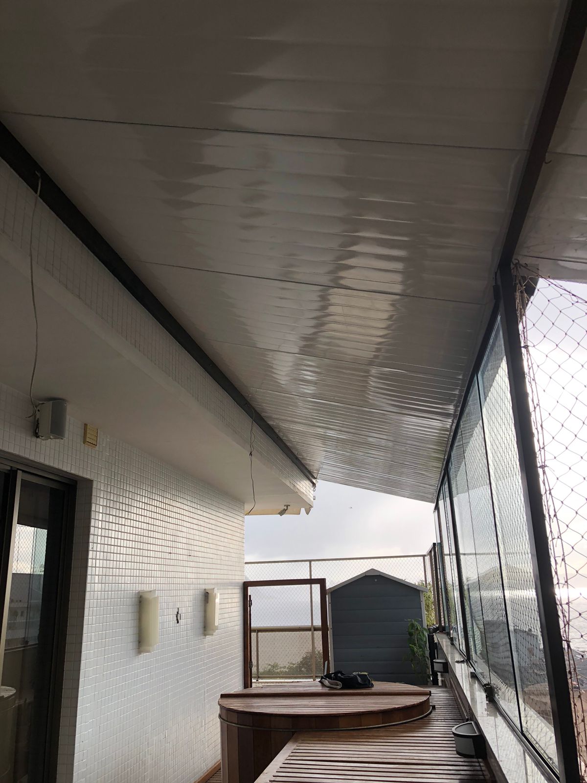 Estrutura firme, com telhas de galvalume, sanduíche de isopor ou telha forro.